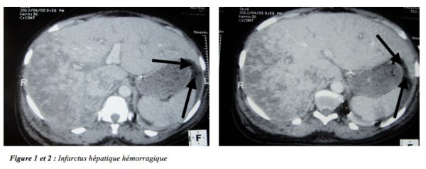 La pré-éclampsie se définit par l’association d’une hypertension artérielle gravidique (PAS ≥ 140 mm Hg et / ou PAD ≥ 90 mm Hg) et d’une Protéinurie > 300mg/j survenant à partir de la 20ème semaine d’aménorrhée (SA) [1]. Les complications sont fréquentes aussi bien maternelles que fœtales. Même si l’atteinte hépatique notamment dans le cadre du HELLP syndrome (Hemolysis Elevated Liver Low Platelets Count) reste fréquente [2], l’ischémie hépatique quant à elle est rarement décrite [2]. Nous rapportons le cas d’une patiente porteuse d’une grossesse gémellaire de 20 semaines d’aménorrhée (SA) compliquée d’éclampsie, de HELLP syndrome et d’un infarctus hépatique.