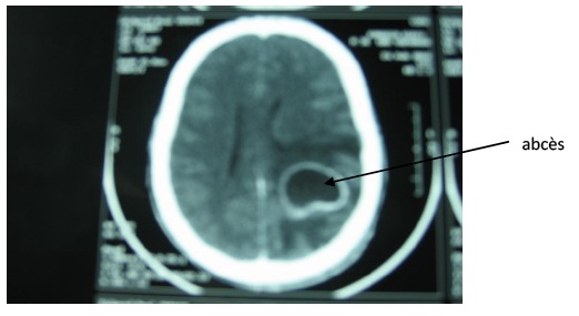 Devant la répétition des convulsions et l’apparition de troubles de la conscience, il est transféré dans un hôpital régional où un scanner cérébral a été effectué Ce scanner cérébral avait mis en évidence un volumineux abcès cérébral pariétal gauche avec un important oedème péri lésionnel et un effet de masse sur le système ventriculaire. Il ne montrait pas de fracture du crâne.