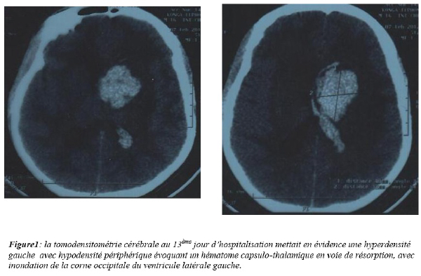 L’évolution était marquée au 4ème jour de son admission par la régression du syndrome infectieux, la persistance de la raideur méningée et un ralentissement psychomoteur justifiant la réalisation d’une tomodensitométrie cérébrale. Celle-ci mettait en évidence un hématome capsulo-thalamique gauche avec inondation ventriculaire. (Figure 1)
