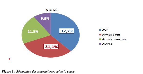 Les causes de ces traumatismes étaient représentées par les accidents de la voie publiques(AVP) : 31cas soit 37,34%, suivi par les armes à feu : 26 cas soit 31,32%.