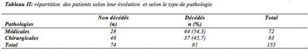 L’évolution des patients selon le type de pathologie est consignée dans le tableau II. Au décours de la prise en charge, 81 patients sont décédés soit 52,25% et 74 patients sont sortis vivants du service soit 47,74%.