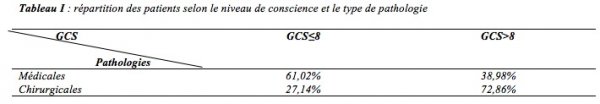 71 patients soit 45,8% avaient un score de Glasgow ≤ 8 et 84 patients soit 54, 1% avaient un score de Glasgow ˃ 8. Le tableau I représente la répartition des patients selon le niveau de conscience et selon le type de pathologie.