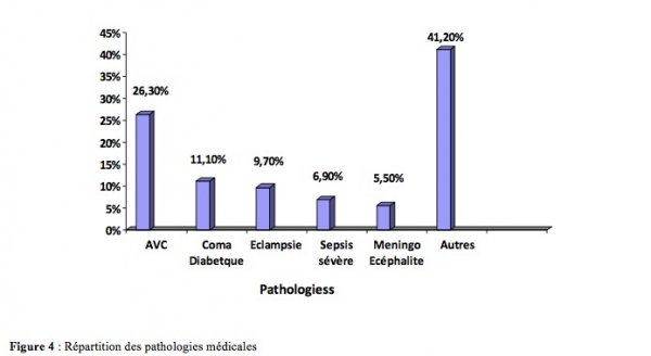 La figure 4 présente la répartition des pathologies médicales. Elles concernaient : L’accident vasculaire cérébral (26,3%), le coma diabétique (11,1%), l’éclampsie (9,7%), le sepsis sévère (6,94%), les méningo-encéphalites (5,5%) et les autres pathologies comme l’asthme aigu grave, les intoxications, les infections néo-natales, les pleurésies, les pneumothorax non traumatiques (41,2%)