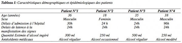 Nous avons colligé de 2010 à 2012 quatre dossiers de patients consécutifs, qui ont été admis dans notre unité de réanimation polyvalente au CHU de Yopougon, pour intoxication à l’alcool frelaté avec cécité.