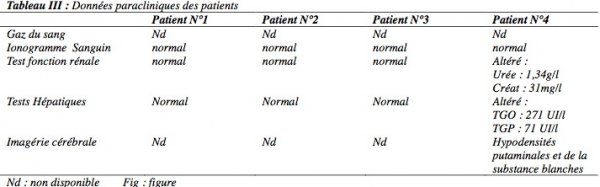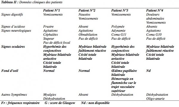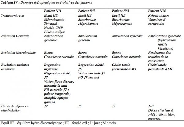 Dans nos 4 cas, la cécité était totale avec une absence de perception lumineuse chez tous les patients. Nous n’avons pu évaluer l’existence éventuelle d’une acidose chez aucun des quatre patients. Le traitement dans tous les cas a été purement symptomatique, sans recours à un antidote, mais tous ont reçu du bicarbonate comme tampon. Dans un cas (patient 4) l’usage a été fait de corticoïdes et d’un complexe de vitamines B1B6. Deux cas (patient1 et 2) ont montré une récupération totale de l’acuité visuelle au bout d’une semaine, sans qu’un traitement spécifique n’ait été mis en œuvre. Mais il est à noter que le fond d’œil dans ces 2 cas n’avait pas montré d’anomalie. Par contre les patients 3 et 4 n’ont montré aucun signe de récupération de la fonction visuelle à un mois. Le patient 4 est décédé un mois plus tard des conséquences de sa perte d’autonomie (cécité, atteintes neurologiques).