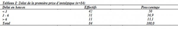 A quarante-huit heures postopératoires toutes les parturientes avaient un EVA compris entre 0 et 3. Les moyennes d’intensité de douleur dans les deux groupes étaient identiques soient 25,47 ±15,43 mm à six heures postopératoire, 23,84±12,19 mm à neuf heures postopératoire, 25,17 ±13,71 mm à 12 heures postopératoire, 22,21 ±13,14 mm à 18 heures postopératoire, 11,22 ± 7,47 mm à vingt-quatre heures postopératoire, 5,29 ±7,61 mm à trente-six heures postopératoire et 2,27±4,89 mm à quarante-huit heures postopératoire. Dans un délai postopératoire inférieur ou égal à 3 heures 50 % avaient reçu un traitement antalgique. (Tableau I).