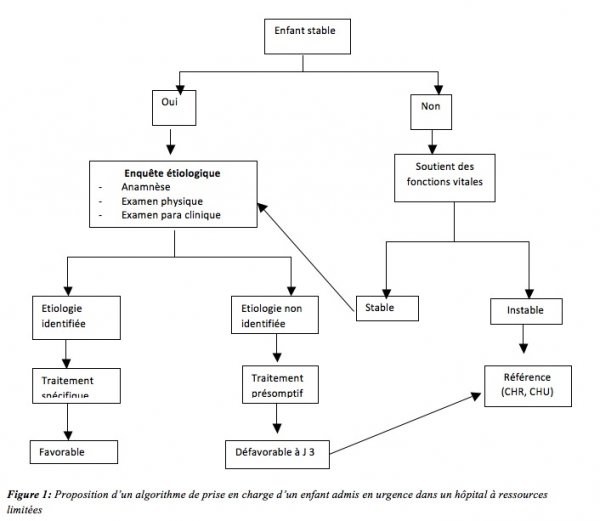 Cette conduite qui se veut pratique repose sur une démarche médicale rigoureuse et méthodique comportant plusieurs étapes successives à savoir : a) l’accueil en priorité de l’enfant et sa famille ; b) le soutien des grandes fonctions vitales si besoins ; c) l’enquête étiologique ; d) la prise en charge thérapeutique (symptomatique et étiologique).