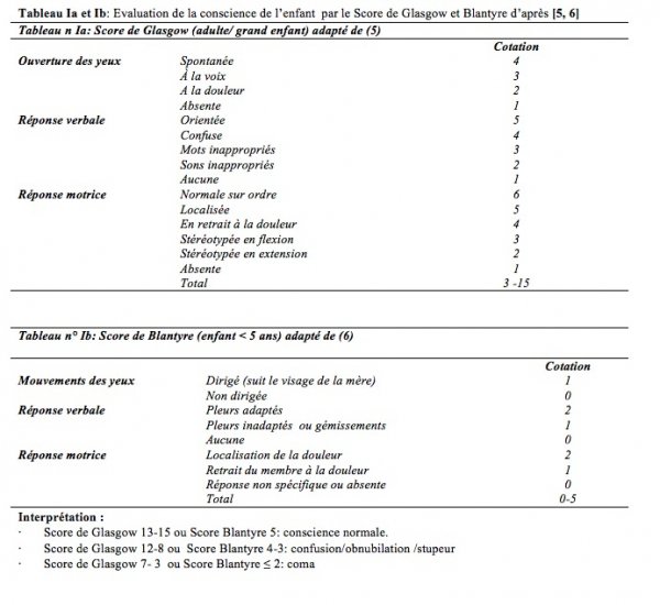 – l’appréciation rapide du niveau de conscience par le score de Glasgow [5] si l’enfant sait parler ou score de Blantyre [6] dans le cas contraire (âge < 3 ans),