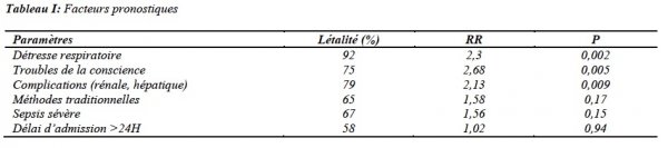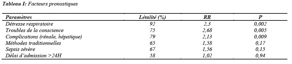 Le délai moyen d’admission était de deux jours (extrêmes : 1 et 21 jours). L’avortement était tardif (>12 semaines) dans 31,57% des cas. L’infection était le principal motif d’admission (44,73%), suivie de l’hémorragie (34,21 %) et des troubles de la conscience (47,37%). Le coma était profond avec un score de Glasgow < 7 chez 21,06% des patientes. Une anémie sévère (taux Hg< 6/dl) était présente chez 13,15% des patientes. Les autres anomalies biologiques étaient une cytolyse hépatique (19%), une insuffisance rénale (13%) et une hépatonéphrite (3%). Toutes les hémocultures sont revenues négatives. L’échographie abdominopelvienne montrait des restes d’avortements dans 26,3% des cas. La TDM cérébrale réalisée chez les patientes présentant des troubles de la conscience montrait dans 3 cas un oedème cérébral diffus. Une intubation orotrachéale a été réalisée chez 55% des patientes, associée à une ventilation mécanique et à une sédation par Midazolam+Fentanyl. L’expansion volémique a été réalisée avec des cristalloïdes dans 94% des cas, et de la gélatine (39%). Une transfusion de culots érythrocytaires a été nécessaire chez 24 % des patientes. Le recours aux amines (Dopamine et ou Dobutamine) a été nécessaire chez 24% des patientes. Le protocole antibiotique se présentait comme suit : Ceftriaxone+Métronidazole+Nétromycine (15 cas ; 39,5%), Ceftriaxone+Métronidazole (13 cas ; 34,2%) et Augmentin (10 cas ; 26,3%). Un geste chirurgical a été nécessaire chez dix-neuf patientes (50%) : un curetage (10 cas ; 26,3%), une hystérorrraphie (2 cas ; 5,3%) et une hystérectomie subtotale (7 cas ; 18,4%). La durée moyenne de séjour était de 2,5 jours. Sur les 38 patientes, vingt-deux sont décédées (58%). La corrélation d’un certain nombre de facteurs retrouvés dans cette étude avec la mortalité fait ressortir que l’existence d’un trouble de la conscience, d’une détresse respiratoire et la survenue de complications exposaient à deux fois au risque de décès (p < 0,05. RR >2) (Tableau II).