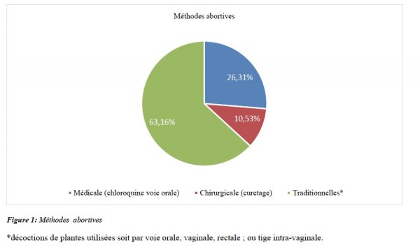 Sur les 1982 femmes admises en réanimation durant la période d’étude, 38 l’ont été pour complications graves après avortement provoqué clandestin ; soit une prévalence de 1,91%. L’âge moyen était de 22 ans (extrêmes : 14 et 37 ans). Les plus fortes prévalences se situaient dans la tranche d’âge de 20-29 ans (61%). La majorité des patientes étaient célibataires (69%) avec une forte proportion d’élèves et étudiants (42%). Elles étaient à leur premier geste abortif dans 58% des cas ; et on notait 39,5% de primipares et 44,7% de nulligestes. Ces avortements se réalisaient majoritairement (42,1%) dans la commune de Yopougon (Abidjan). Les méthodes abortives traditionnelles étaient les plus utilisées (Figure 1).