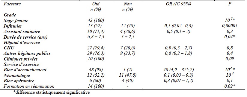 Parmi les 82 agents de santé enquêtés, 34 (41,5%) d’entre eux exerçaient au CHUB, 38 (46,3%) dans les hôpitaux de base et 10 (12,2%) dans une clinique privée. Selon le grade, 43 (52,4%) étaient des sages-femmes, 25 (30,5%) des infirmiers d’état généralistes et 14 (17,1%) des assistants sanitaires. Le service d’exercice étaitle bloc d’accouchement dans 49 cas (59,8%), le service de néonatologie dans 23 cas (28%) et le bloc opératoire dans 10 cas (12,2%). Une formation sur la réanimation du nouveau-né a été reçue par 14 agents (17,1%). La durée moyenne de service avoisinait 6,0 ± 6,8 ans (extrêmes : 1 mois - 32 ans).