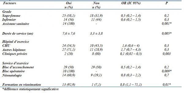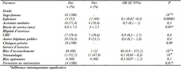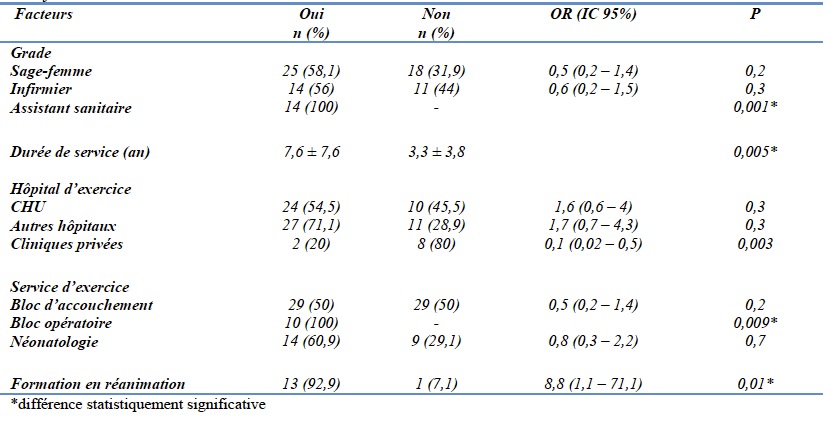 La connaissance du score d’Apgar selon le grade, l’hôpital, le service, la durée d’exercice et la formation en réanimation du nouveau-né est mentionnée dans le tableau I.