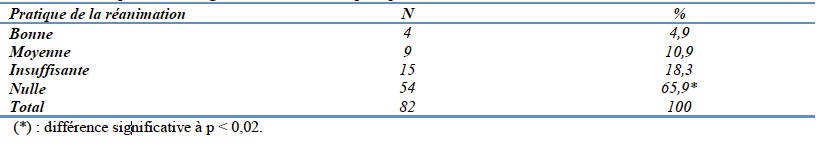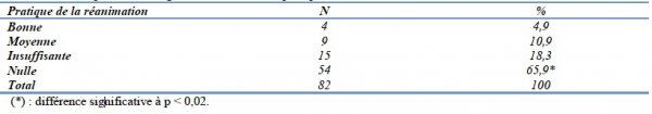 Enfin, les techniques pratiquées étaient la désobstruction (65,9% des citations ; n = 54), le massage cardiaque externe (46,3% des citations ; n = 38), la ventilation au masque (29,3% des citations ; n = 24), la lutte contre l’hypothermie (17,1% des citations ; n = 14) et l’intubation (4,9% des citations ; n = 4). Le tableau III dénombre les agents de santé selon leur pratique de la réanimation néonatale.
