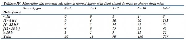 Le taux de décès maternel était de 0,6%. Les décès les plus fréquentes étaient l’hémorragie de la délivrance, la rupture utérine, la grossesse extra-utérine, l’éclampsie et le HELLP syndrome. Parmi les naissances, 56, % des nouveau-nés avaient un bon score d’Apgar (8-10) ; 43,7% avaient bénéficié d’une stimulation et d’une oxygénation au bloc (score d’Apgar inférieur à 8) et 7,5% étaient des mort-nés (tableau IV).