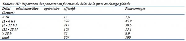 Le délai moyen de l’entrée au bloc opératoire à l’induction anesthésique était de 18,2±13,6 minutes avec des extrêmes d’1 et 60 mns. Le délai global moyen de prise en charge était de 7,7±5,8 heures. 45,9 % des patientes ont été césarisées entre la 1ère et la 6ème heure après leur admission en maternité (tableau III). De la salle de réveil, 97,4 % des patientes ont été transférées en hospitalisation d’obstétrique, 2 % en réanimation pour des troubles de la conscience dans un contexte d’éclampsie.