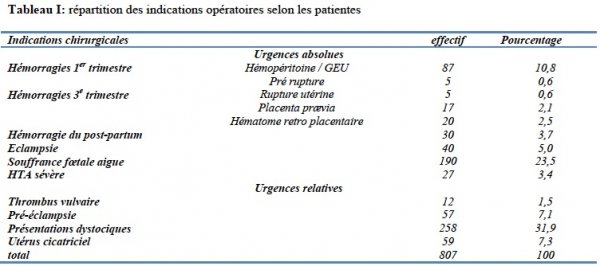 Les indications opératoires étaient surtout les présentations dystociques, la souffrance foetale aigue, les hémorragies du 3è trimestre et la grossesse extra-utérine (tableau I).