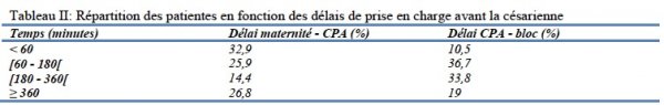 Les différents délais de prise en charge ont été évalués (tableau II) : de l’admission à la maternité à l’évaluation pré-anesthésique (202,3±229,9 mn avec des extrêmes de 5 et 1320 mns), de l’évaluation pré-anesthésique à l’entrée au bloc opératoire (272,7±323,2 minutes avec des extrêmes de 5 et 1438 mns).
