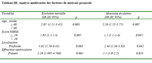 Le tableau III présente l’analyse multivariée des variables influençant le pronostic. Les facteurs indépendants influençant la mortalité intra hospitalière sont l’âge élevé, le score NIHSS élevé, la localisation profonde et l’effraction ventriculaire.