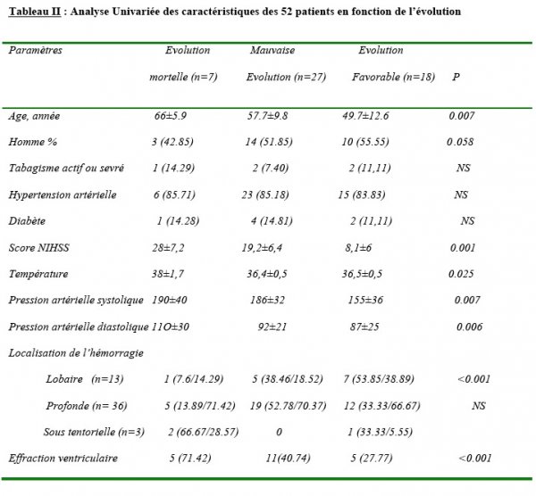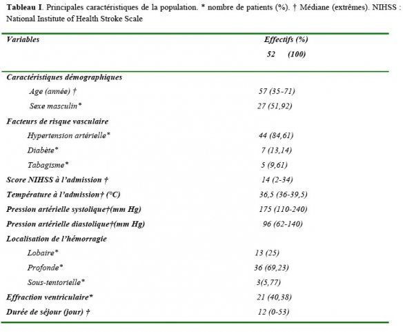 Cinquante-deux patients ont été recrutés dont 27 hommes et 25 femmes avec un âge moyen de 57 ans (Le tableau I) présente les principales caractéristiques de nos patients. Nous avons enregistré 13% de décès durant les deux premières semaines. La durée moyenne de séjour est à 12 jours. L’âge, le score NIHSS élevé, et la localisation profonde avec effraction ventriculaire sont associés à un mauvais pronostic vital encours d’hospitalisation et fonctionnel à trois mois.