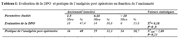 Paramètres portant sur l’évaluation de la douleur post opératoire 43,2% évaluaient fréquemment la DPO (Tableau I), 36,3 % rarement et 17 % n’évaluaient jamais la DPO.