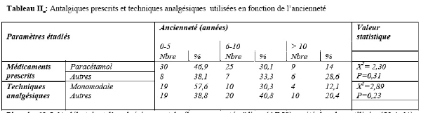 85,2 % pratiquaient de façon systématique l’analgésie post opératoire (Tableau I). 37,5 % pratiquaient l’analgésie monomodale (Tableau II).