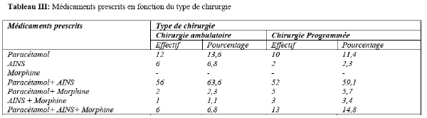 Plus de 62,5 % débutaient l’analgésie avant la fin de l’intervention chirurgicale et 39,8 % continuaient une analgésie maximale jusqu’à la 48h. L’association paracétamol et anti inflammatoire non stéroïdien (AINS) a été la plus utilisée (59,1 %) (Tableau III).