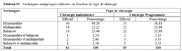 La morphine n’était utilisée que par 3, 4 % de praticiens et personne n’utilisait les techniques de l’analgésie locorégionale en post opératoire. La technique analgésique variait selon qu’il s’agissait d’une chirurgie ambulatoire ou d’une chirurgie programmée. L’analgésie monomodale était la plus appliquée quel que soit le type de chirurgie suivie de l’analgésie balancée et de l’analgésie multimodale (Tableau IV).