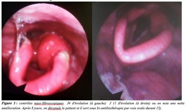 Un bilan biologique montre une hyperleucocytose à 19770/µl avec une CRP à 125 mg/l. Des examens au nasofibroscope se font chaque 48h pour une surveillance locale témoignant d’une nette régression de l’inflammation et de l’œdème ainsi que la liberté progressive de la filière laryngée (Figure 3)
