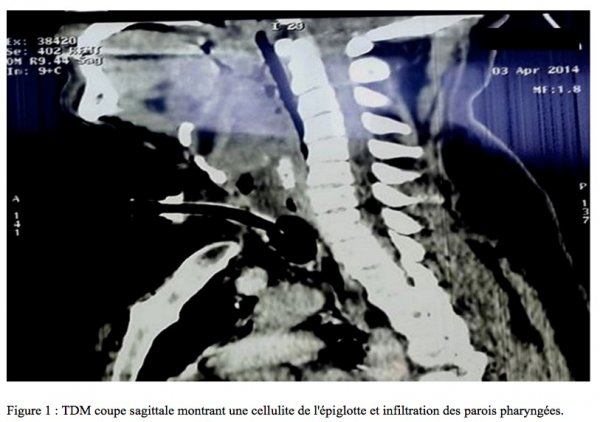 Après rétablissement de l’état respiratoire et hémodynamique, le patient bénéficie d’une nasofibroscopie qui montre un œdème de la base de la langue qui arrive au contact de la paroi postérieur de l’oropharynx, structures laryngées invisibles. Une tomodensitométrie cervico-thoracique objective un épaississement et une infiltration des parois oropharyngées et des structures laryngées avec cellulite de l’épiglotte obstruant complètement la filière respiratoire (Figure 1).