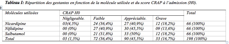 De nos 198 patientes, 51,5% (n=102) avaient un âge gestationnel compris entre 32SA+1jr et 34 SA et 37,9% (n=75) entre 28 et 32 SA. Chez 51 gestantes soit 25,8%, il s’agissait d’une grossesse gémellaire. Dans le groupe de la nicardipine, 40,9% (n=27) avaient un CRAP appréciable et 18,2% (n=12) un CRAP grave. Dans le groupe de la nifédipine, 45,5% (n=30) avaient un CRAP appréciable et 13,6% (n=09) un CRAP grave. Dans le groupe du salbutamol, 50% (n=33) avaient un CRAP appréciable (tableau I).
