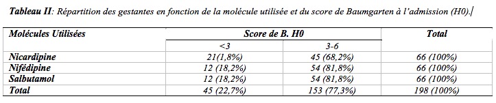 Il s’agissait d’une étude analytique d’observation avec collecte de données prospective. Elle est étalée sur une période de un an (du 01 Janvier 2012 au 31 Décembre 2012). La population d’étude était constituée de toutes les gestantes admises à la CUGO pour menace d’accouchement prématuré et ayant bénéficié d’une tocolyse à la nicardipine, à la nifédipine ou au salbutamol. Toutes les gestantes présentant des contractions utérines avec modification du col sur un terme entre 28 SA et 36 SA + 06 jours pendant la période d’étude et ayant donné leur consentement éclairé étaient incluses. Il s’agit d’un échantillonnage exhaustif. L’ordre d’administration des tocolytiques a été choisi de façon arbitraire. Ainsi la première gestante était tocolysée avec la nicardipine, la seconde avec la nifédipine et la troisième avec le salbutamol. Si une gestante présentait une contre-indication à la molécule qui devait lui être utilisée, on changait de molécule et la gestante n’était plus incluse dans l’étude. Celle qui présentait des effets indésirables à l’une ou l’autre des molécules l’arrêtait et la remplaçait par une autre de notre choix. Le traitement tocolytique était considéré comme une réussite en absence d’accouchement prématuré dans les 48 heures qui suivaient le début du traitement sans changement de molécule. Il est considéré comme un échec s’il y a persistance des contractions utérines au-delà ou un accouchement prématuré avant les 48 heures. Comme outils de collecte, nous avions utilisé : la fiche d’enquête, la fiche du score de Baumgarten et la fiche de Coefficient de Risque d’Accouchement Prématuré (CRAP). Dans un premier temps, les patientes admises pour menace d’accouchement prématuré étaient recensées au fur et à mesure avec en mention le numéro de dossier et les informations obtenues à l’examen initial. Dans un second temps, nous prenions les dossiers des malades concernées pour recueillir les informations utiles relatives à l’examen de la 48ème heure et après accouchement. Les différentes données étaient saisies sur ordinateur puis analysées à l’aide des logiciels EPI INFO et SPSS. Pour la comparaison des variables qualitatives nous avions utilisé les tests statistiques de Khi carré de Pearson, le test de khi2 corrigé ou encore le test exact de Fisher. Pour les variables numériques nous avions procédé à une analyse des variances. Les tests statistiques des résultats étaient effectués au seuil alpha égal à 0.05 que nous avions considéré comme statistiquement significatif. Au total, 198 gestantes étaient recensées. Toutes les gestantes entrant dans notre étude avaient reçu chacune un formulaire de consentement. Pour celles qui n’étaient pas instruites, il leur était expliqué les risques encourus. Tout au long de notre étude le respect des valeurs, de la pudeur, des droits et lois propres à l’individu étaient observés. L’anonymat était respecté et Il n’existait pas de conflit d’intérêt