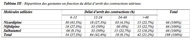 Selon Merger, l’accouchement prématuré est l’accouchement qui se produit entre 6 mois et 8 mois et 1/2, c’est-à-dire entre la 28e et la fin de la 37e semaine d’aménorrhée [1]. Les progrès de la néonatologie ont permis d’abaisser la limite inférieure de la prématurité à 24 voire à 22 semaines d’aménorrhée. Ainsi donc pour l’Organisation Mondiale de la Santé, l’accouchement prématuré est l’expulsion d’un produit de conception pesant au moins 500 grammes et manifestant des signes de vie. Si le poids est inconnu, on retient un âge gestationnel ≥ 22 SA ou une taille ≥ 25 cm [2]. La prématurité pose un problème de santé publique de par sa fréquence. A la Clinique Universitaire de Gynécologie Obstétrique (CUGO) du Centre National Hospitalier et Universitaire Hubert Koutoukou Maga (CNHU-HKM) la fréquence des accouchements prématurés était de 9,5% en 2005. Cette prématurité entrainerait une mortalité périnatale 20 fois supérieure à celle des enfants nés à terme. Il importe alors d’éviter la prématurité par une prise en charge adéquate des menaces d’accouchement prématuré (MAP) dans des conditions qui entrainent d’effets secondaires pour la mère et le fœtus. La prévention de l’accouchement prématuré est au premier rang des préoccupations de l’obstétricien, l’avenir des prématurés étant compromis comme l’indiquent Takpara I. et all. qui rapportent que les causes de morbi-mortalité néonatale étaient dominées par la prématurité dans 48% des cas. Cette prévention passe par le dépistage des patientes à risque d’accouchement prématuré et la prise en charge de la menace d’accouchement prématuré [3]. La menace d’accouchement prématuré dans 62,6% des cas, est l’une des principales causes d’hospitalisation au cours de la grossesse selon Randriambololona D. et all. à Madagascar, et conduit à un accouchement prématuré dans près de 50 % des cas [4]. Dans la prise en charge de la menace d’accouchement prématuré vient au premier plan la tocolyse qui est un traitement visant à diminuer ou arrêter les contractions utérines avec pour objectif de prolonger la grossesse afin de limiter les conséquences de la prématurité en termes de mortalité et de morbidité néonatale. Les tocolytiques les plus couramment utilisés sont les bêtamimétiques (salbutamol), les antagonistes de l’ocytocine (atosiban) et les inhibiteurs calciques (nifédipine et nicardipine). Le choix de l’arsenal thérapeutique, dans le souci d’un traitement peu couteux s’est tourné vers les inhibiteurs calciques (nifédipine et nicardipine) qui ne possèdent pas d’autorisation de mise sur le marché (AMM) pour le traitement de la MAP mais leur efficacité tocolytique a été démontrée par plusieurs essais randomisés [18,21,22]. Dans ce contexte, il nous paraît opportun d’étudier dans notre milieu tropical, l’efficacité des inhibiteurs calciques et des bêtamimétiques dans la prise en charge des MAP. Ces molécules sont utilisées à la CUGO depuis 2006 dans cette indication mais aucune étude n’a effectué une mise au point sur leur tolérance. L’objectif était de comparer l’efficacité des bêtamimétiques (salbutamol) et des anticalciques (nifédipine et nicardipine) dans la tocolyse des menaces d’accouchement prématuré.