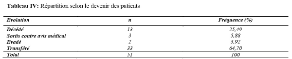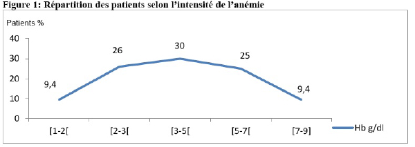 A l’admission, 33 (65%) patients avaient une anémie sévère avec un taux d’hémoglobine de moins de 5g/dl dont 25% inférieur à 4g/dl, 9% avaient un taux d’hémoglobine de plus de 7g/dl (Figure 1).