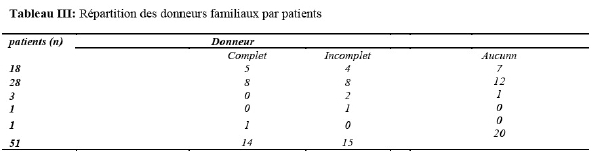 Les réactions transfusionnelles de type frissons, hyperthermie ont été retrouvées chez 8% des patients.Concernant les donneurs de sang compatibles, 14 patients (27%) avaient un nombre complet de donneur ; 22% n’en avaient trouvé aucun (Tableau III).