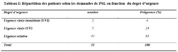 La prescription des produits sanguins labiles (PSL) a été basée sur l’évaluation initiale des degrés d’urgence. Les urgences vitales représentaient 14% (Tableau I).