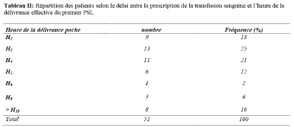 Aucun patient n’a pu bénéficier d’une transfusion sanguine avant la deuxième heure, 29 patients (57%) ont reçu une poche de sang au-delà de la troisième heure (Tableau II)