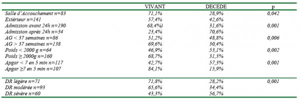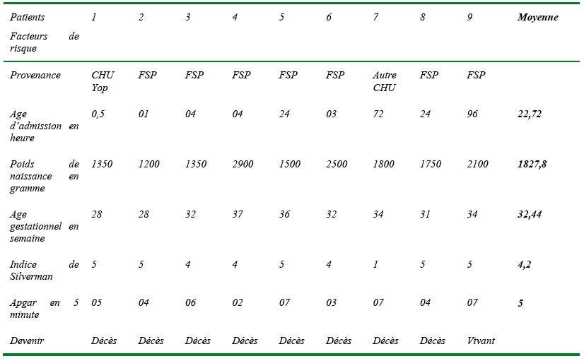 Les nouveau-nés qui avaient un mauvais score pronostic provenaient dans 8 cas sur 9 (89%) de la périphérie. Ils avaient dans 67% des cas un poids de naissance inférieur à 2000 g. Leur âge gestationnel était dans 89% des cas inférieur à 37 SA avec une moyenne de 32 SA. Tous avaient un Indice de Silverman supérieur ou égal à 4. Le score d’Apgar était inférieur ou égal à 7 à la 5ième minute avec une moyenne de 4,75. Ils avaient tous les facteurs de mauvais pronostic.