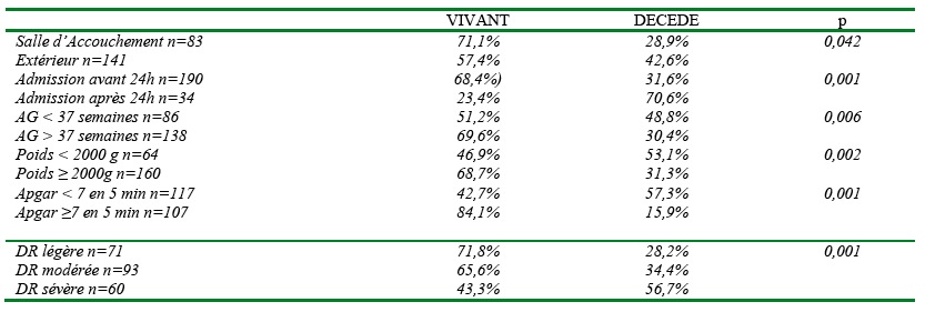 Le taux de mortalité était de 37,5% (84/224) ; 140 nouveau-nés sont sortis vivants dont 6 (2,7%) contre avis médical. Les nouveau-nés décédés provenaient à 71,4% de la périphérie et à 28,6% de la salle d’accouchement (p=0,042). Le score pronostic était bon pour 2,7% (6/224) ; modéré pour 93,3% (209/224) et mauvais pour 4% (9/224). Tous les nouveau-nés ayant un bon pronostic sont sortis vivants. L’analyse de chaque facteur de risque par le calcul des moyennes a été mentionnée dans le tableau I.