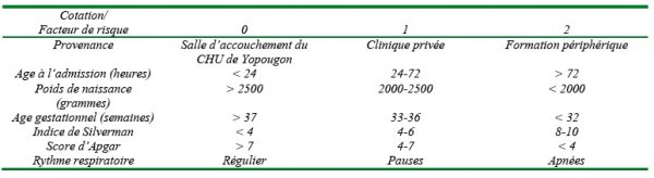 Tous les nouveau-nés de 0 à 28 jours ayant une détresse respiratoire avant l’admission ou dans les 24 heures après l’admission ont été inclus. La détresse respiratoire a été considérée comme légère pour un indice de Silverman compris entre 1 et 2, modérée pour un indice compris entre 3 et 4 et sévère pour un indice supérieur ou égal à 5 [4]. Les pauses respiratoires ont été considérées pour des arrêts respiratoires inférieurs à 20 secondes et les apnées pour des arrêts supérieurs à 20 secondes. Le score pronostic selon Yopougon a été établi pour tous les nouveau-nés inclus. Chaque facteur était coté de 0 à 2 en fonction de la gravité [3]. Le score de Yopougon est mentionné sur le tableau ci-dessous. Selon ce score, le pronostic était bon pour un score à 0, moyen pour un score entre 1 et 7 et mauvais pour un score entre 7 et 14. Plus le score pronostic était élevé plus grand était le risque de décès. La mortalité variait entre 50 et 64% pour les populations ayant les facteurs de mauvais pronostic et 20 et 30% pour celles ayant les facteurs de bon et moyen pronostic [3]. Nous avons exclu de l’étude les prématurés d’âge gestationnel inférieur à 25 SA, les nouveau-nés décédés avant l’admission en hospitalisation, les naissances à domicile et les dossiers incomplets. Tous les nouveaux nés sortis contre avis médical (SCAM) ont été inclus dans le groupe des nouveau-nés considérés vivants.