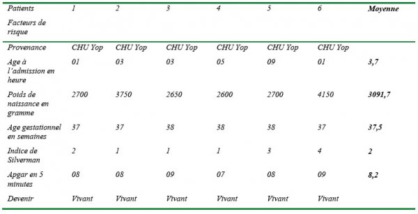 Tous étaient sortis vivants. Ils provenaient tous de la salle d’accouchement du CHU de Yopougon. Ils avaient tous été admis avant la 9ième heure et étaient tous nés à terme avec un âge gestationnel moyen de 37,5 SA. Le poids de naissance moyen était de 3091grammes. L’indice de Silverman moyen était de 2 et l’Apgar à 5 min était supérieur ou égal à 7. Ils ne présentaient donc aucun des facteurs de risque évalués.