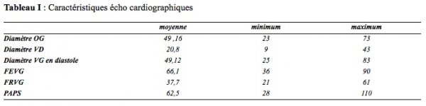 A l’électrocardiogramme, 23,3 % de nos patients avaient un rythme cardiaque non sinusal, 26,6 % un rythme cardiaque non régulier et 20 % de l’ensemble des patients étaient en arythmie complète par fibrillation auriculaire. Pendant qu’un des patients était en flutter auriculaire.Les caractéristiques échographiques sont mentionnées au tableau I