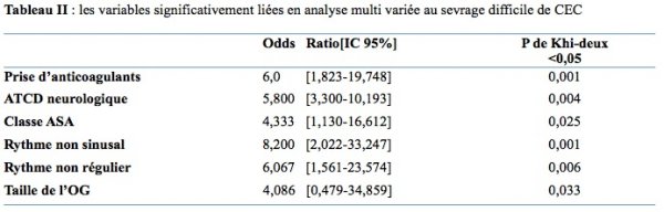 L’odds ratio ou estimation des risques a quantifié le risque de sevrage difficile de CEC pour les variables reconnues comme prédictives. L’analyse des risques et la régression logistique ont permis de mesurer l’impact des différentes variables sur le phénomène étudié.