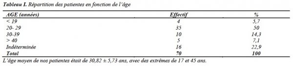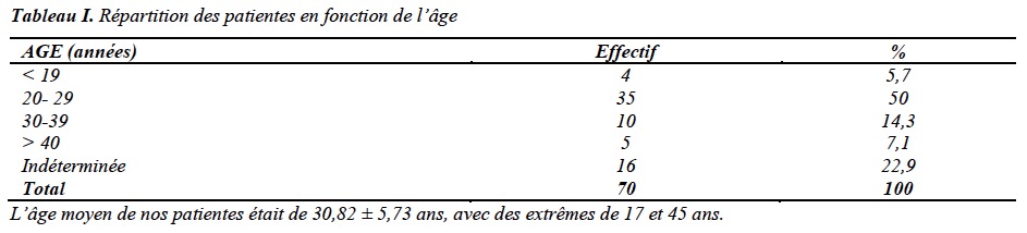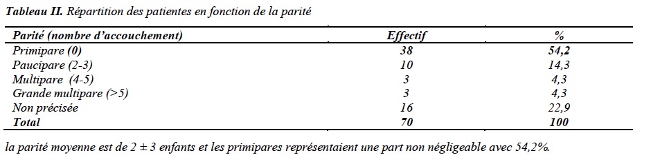 Le tableau I montre la répartition des patientes selon l’âge tandis que le tableau II illustre la répartition selon la parité.
