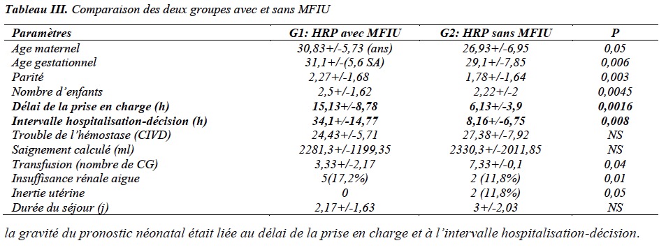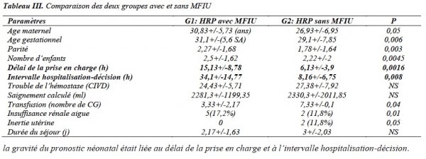La césarienne en extrême urgence était dans tous les cas indiquée dans notre contexte quel que soit l’état du foetus. En cas de mort foetale, l’accouchement par voie vaginale pouvait être privilégié. Les troubles de l’hémostase s’associaient au choc hémorragique et l’aggravaient. Des signes de choc hémorragique sont parfois associés lorsque l’hématome est important. L’HRP prend alors la forme clinique d’une menace d’accouchement prématuré et/ou d’une souffrance foetale aiguë ou d’une mort foetale inexpliquée ; il peut passer inaperçu lorsque l’expression clinique est la mise en route du travail obstétrical, volontiers hypercinétique et hypertonique compliqué d’anomalies de rythme cardiaque. Le diagnostic de l’HRP peut être alors porté de façon rétrospective par l’examen du placenta après l’accouchement par voie basse ou la césarienne.