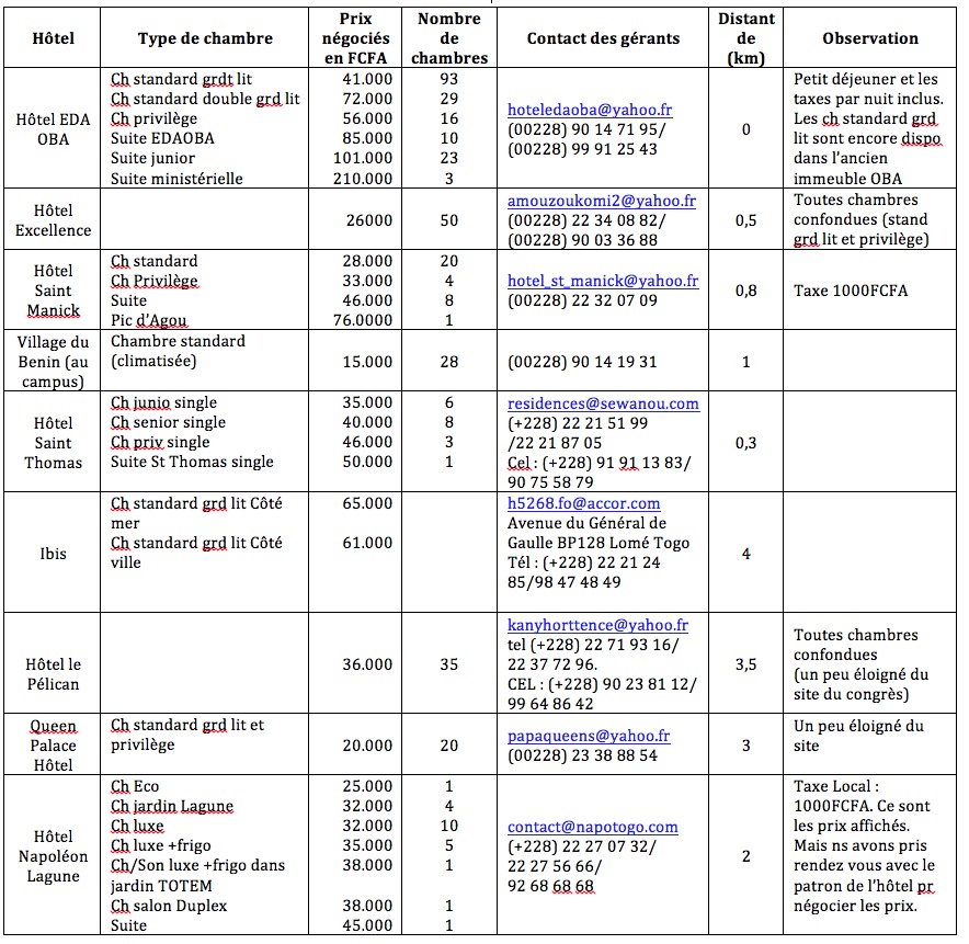 LISTE DES HOTELS CONGRES SARANF 2014 LOME – TOGO, HOTEL EDA-OBA DU 19-21/11/2014 CONTACT : (+228) 90 26 22 84/90 14 41 44