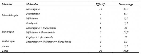 Les mesure hygiéno-diététiques comportaient le régime sans sel (86,7%), le repos (63,3%), la restriction hydrique (56,7%), le régime hypo protidique (53, 3%), le régime hypokaliémiant (46,7%). Les deux dernières prescriptions étaient indiquées chez des enfants qui avaient une insuffisance rénale. Dans 29 cas, un traitement antihypertenseur avait été administré en première intention. L’antihypertenseur était prescrit en monothérapie (46,6%), en bithérapie (46,7%) et en trithérapie (3,3%). La Nicardipine était la molécule prescrite dans la majorité des cas en monothérapie (71,4%). La répartition du traitement antihypertenseur est donnée dans le tableau V.