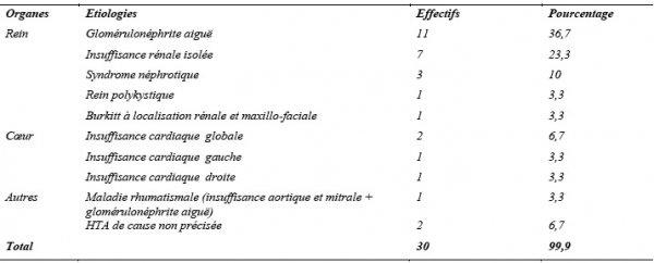 Les principales étiologies de l’HTA étaient dominées par les maladies rénales dans76,6% des cas (Tableau n° IV). La glomérulonéphrite aiguë (47,8%) et l’insuffisance rénale (30,4%) représentaient 78,2% des affections rénales.