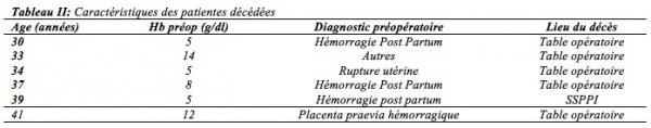 Les caractéristiques des patientes décédées en rapport avec l’âge, le diagnostic et le taux d’hémoglobine préopératoires, ainsi que le lieu de décès sont résumées dans le tableau II.