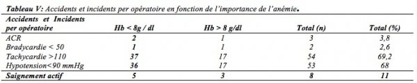 Il n’y a pas eu une différence statiquement significative, mais l’on a noté une fréquence plus grande de survenue des incidents et accidents per opératoires chez les patientes qui avaient un taux d’hémoglobine pré opératoire inférieur à 8 g/dl.