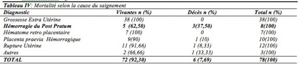 Les causes de saignements selon le diagnostic préopératoire ont été : pour près de la moitié des cas (48,7%) des grossesses extra utérines (GEU) dont plus de 90% étaient rompues (34 sur 38 GEU), pour 47,5%, des hémorragies d’origine utérine (Ruptures utérines(RU), placenta prævia hémorragiques(PPH), hémorragies du post partum (HPP), hématomes rétro placentaires(HRP)) et 3,8% de causes non classées.